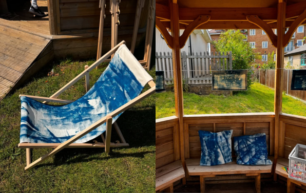 The children visited the Unravel textile exhibition at the Barbican Centre in preparation for the slowmotion workshop with Wei-Ting Ma. They have learned about domestic practices of care and low cost, low carbon interventions into public spaces. They reflected on the connection between textiles and communities, which would later reappear as a central element in the design of the garden. The cyanotype lounge chairs and curtains echo the continuous care and engagement with the living environment of the garden.