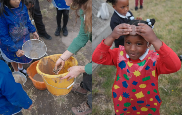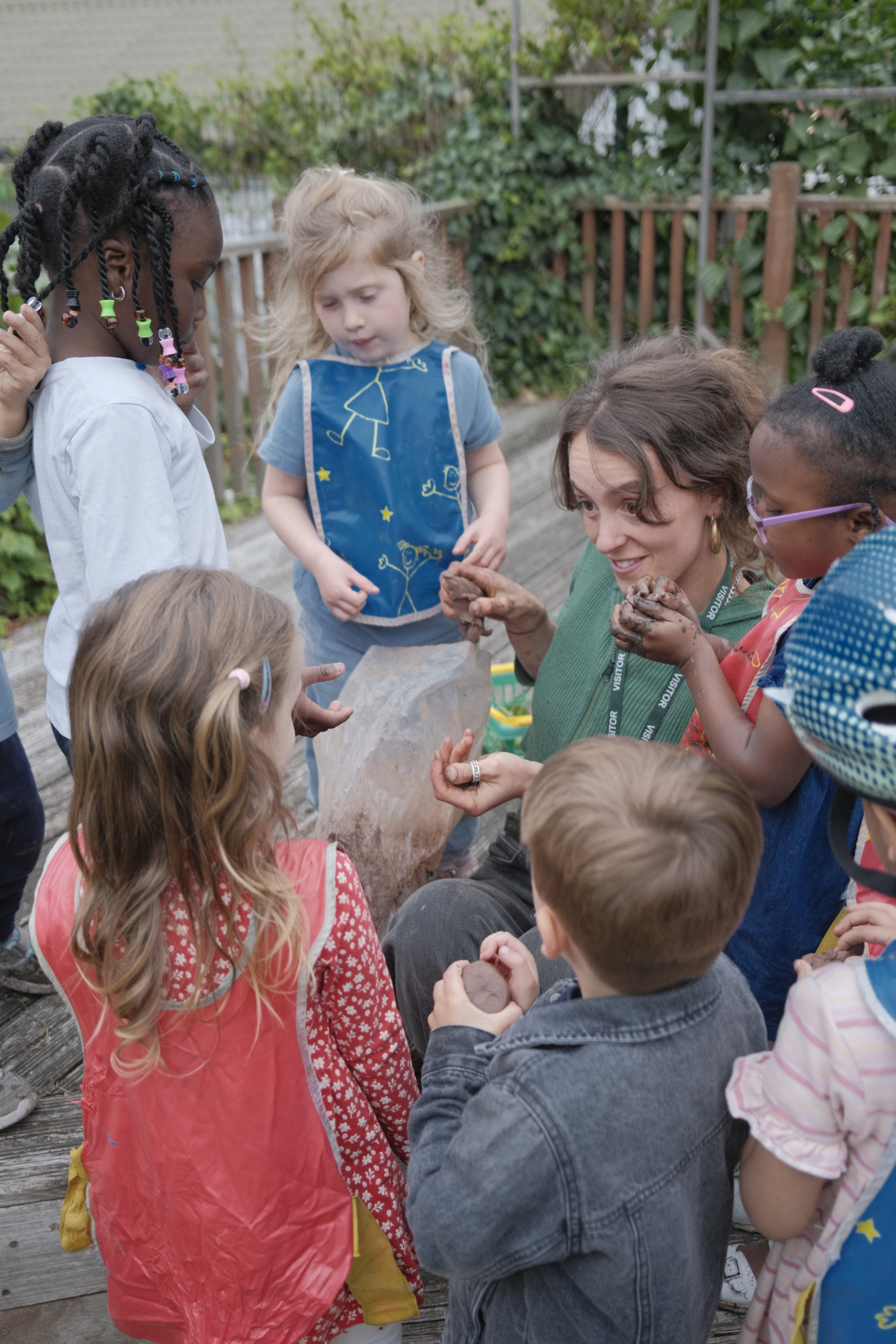 Jessy shared her practice of biomaterial production and locally-sourced ceramic making. They created Blobsters that watch over and care for the garden, while contributing to the physical memory embedded in the space. They were created from clay made from the garden itself, mixed with clay from various ecological sites around London, teaching the children about material processes and eco-friendly practices. Using materials already present in the garden highlighted both the intrinsic creative potential of the space and made them learn about circular materials and low-carbon practices.